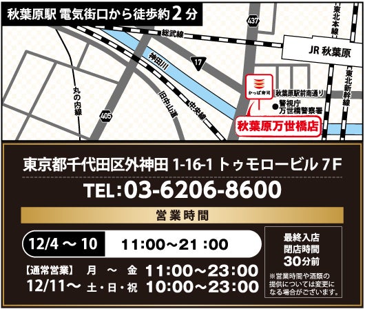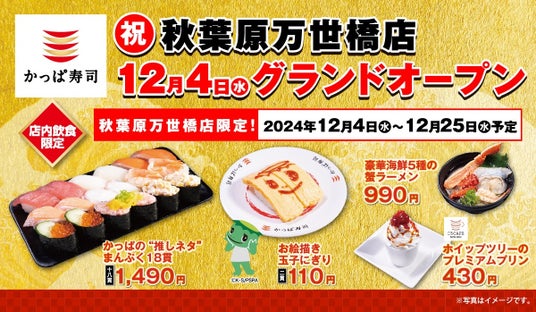 コロワイドグループのかっぱ寿司(カッパ・クリエイト(株) 本社:神奈川県横浜市、代表取締役社長:山角豪)は、2024年12月4日(水)に『かっぱ寿司 秋葉原万世橋店』をオープンいたします。