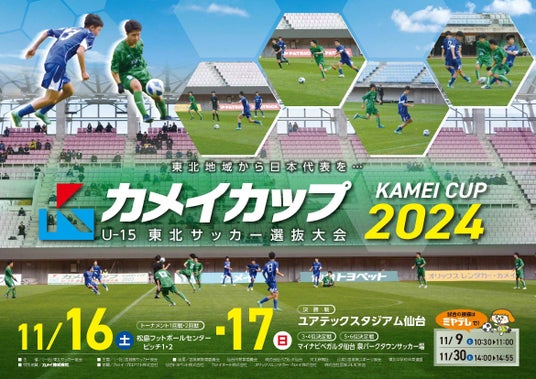 カメイ株式会社(本社:宮城県仙台市、社長:亀井 昭男、以下「当社」)が特別協賛する「カメイカップ2024 U-15 東北サッカー選抜大会」が、2024年11月16日(土)から17日(日)にかけて、宮城県仙台市、宮城郡松島町などで開催されます。本大会には当社のほか、当社グループも協賛し、大会を応援しています。
