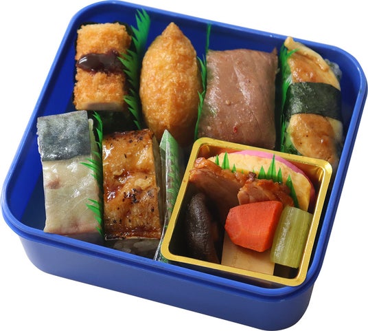 【内容】穴子寿司、赤レンガローストビーフ寿司、わさび風味いなり寿司、味噌カツ寿司、はも寿司、バッテラ各1個)