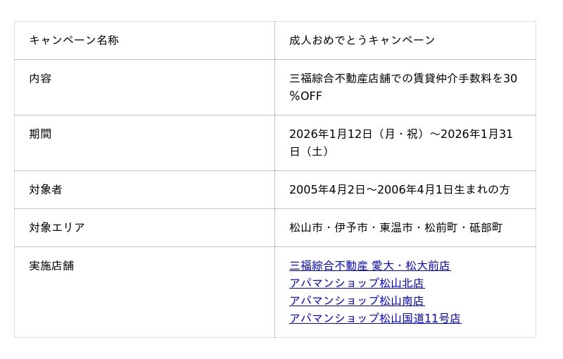 株式会社三福綜合不動産(本社:愛媛県松山市)は、2026年1月12日(月・祝)より、新成人を対象とした期間限定企画「成人おめでとうキャンペーン」を開始します。対象者は賃貸マンション・アパートの仲介手数料が30%割引となります。