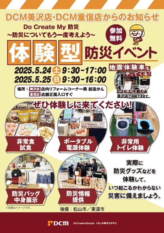 当社は、最新の防災ノウハウ・防災用品を紹介する防災啓発活動をDCM各店舗や地域防災イベント等で実施する他、小中学校での防災授業など地域の防災意識向上に努めています。一方、防災用品を揃えるにあたり、「使用方法がわからない」、「試してみたいが機会がない」、「非常食の味がわからない」など多くのご意見があったことから、実際に商品をお試しいただける体験型防災イベントを2024年8月にDCM DIY place(東京都渋谷区)と2025年2月にDCM21名古屋城北店で実施しました。