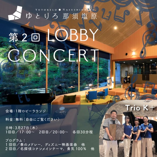 “想いをつむぎ、新しさでつなぐ”「Relo Hotels&Resorts(リロホテルズ&リゾーツ)」の温泉旅館「ゆとりろ那須塩原」(所在地:〒329-2921 栃木県那須塩原市塩原1115-2)は、皆様に思い出に残る特別な時間をお過ごしいただけるよう2025年3月27日ロビーコンサートを開催いたします。
