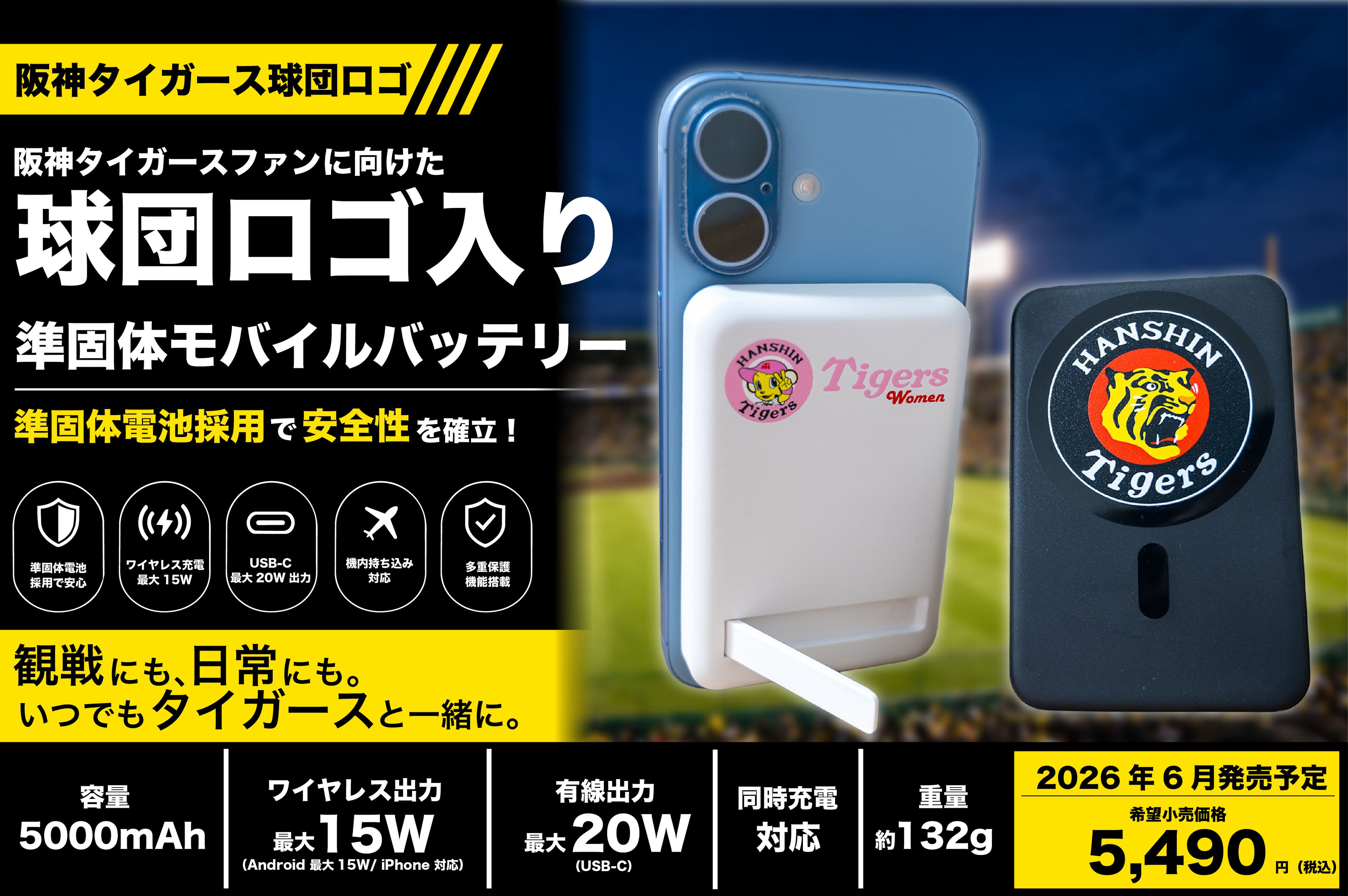 本製品は、安全性に配慮した準固体電池を採用することで、これまでの三元系リチウムイオンバッテリーと比較して発火などのリスクを大幅に低減させ、高温になりやすい場所でも安全にお使いいただける設計となっております。また、日常使いしやすいデザイン性を兼ね備えた、阪神タイガースファン向けのモバイルバッテリーです。