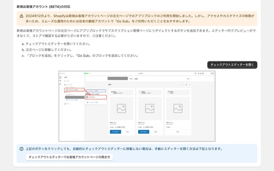 ※ チェックアウトエディター内でアプリブロックやサブスクリプションページのプレビューができず、アプリブロックを追加いただいていても表示がされません。