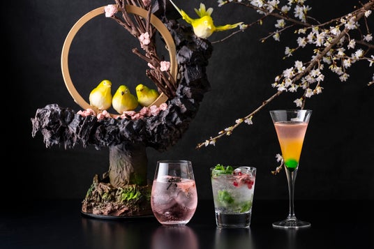 さくらめぐりの締めくくりには落ち着いた雰囲気のメインバーで桜香るジン「六 ROKU」を使用しアレンジした春らしい3種のカクテルをお楽しみいただけます。