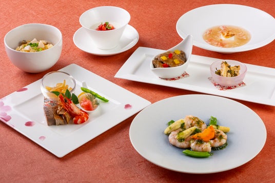 ランチはまるで桜の花びらが舞っているかのような春らしい見た目の蟹肉入りフカヒレスープ、ディナーは桜エビ入りXO醬が添えられた大海老と野菜の炒めで春を感じる王道の中国料理を召しあがれます。
