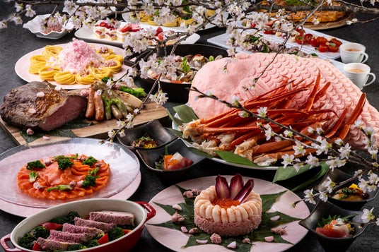 桜香塩と糀で24時間マリネしたローストビーフや桜色のチーズをふんだんにかけ仕上げた黒胡椒とチーズのパスタなどのさくら色メニューやディナー限定の桜の葉と一緒に焼き上げた香り高い鯛の塩釜焼きを召しあがれる春爛漫のブッフェです。