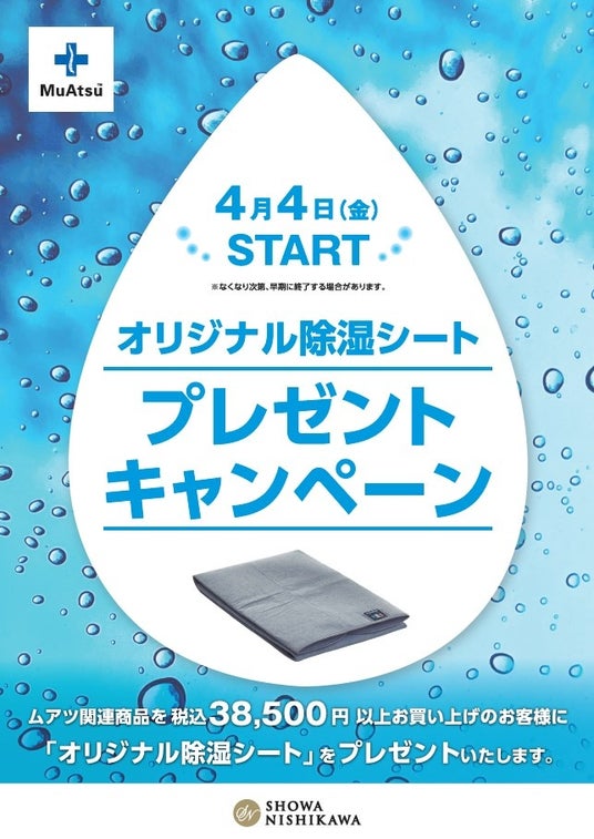 皆様に快適な睡眠環境を提供するため、昭和西川株式会社(東京都中央区、代表:西川惠)は、MuAtsu(ムアツ)を中心としたさまざまな寝具をご提案しています。今回は寝苦しさを感じる梅雨の湿気対策として、ムアツ マットレス税込38,500円以上お買い求めいただいたお客様に“オリジナル除湿シート”をプレゼントするキャンペーンをスタートいたします。