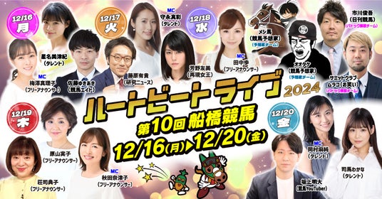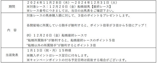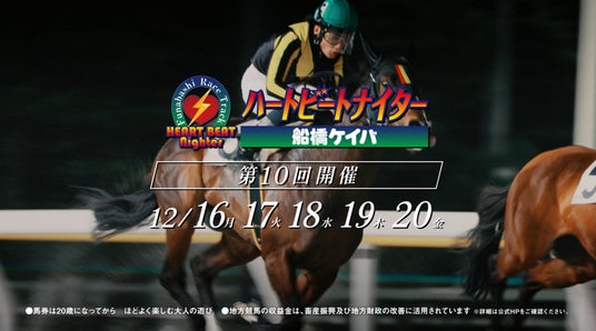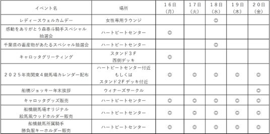 船橋ケイバでは、令和6年度第10回開催を12月16日(月)~12月20日(金)に開催いたします。第10回開催では、女性のお客様へ入浴剤をプレゼントする「レディースウェルカムデー」や、千葉の畜産物が当たる「畜産物抽選会」など多数のイベントを実施いたします。また、12月16日(月)に森泰斗騎手の引退セレモニーや森泰斗騎手引退記念グッズがあたる抽選会などもおこないます。2024年最後の船橋ケイバ開催もぜひお楽しみください!