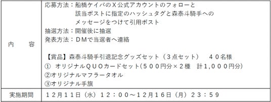 引退セレモニー当日の16日(月)に、森泰斗騎手引退記念グッズが当たる抽選会を実施します。