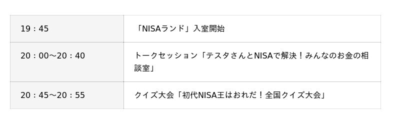 (注)デジタルギフト券がもらえるアトラクションは本イベント開催時間内(20時00分~21時00分)に実施予定です。概要およびタイムテーブルは予定であり、事前の予告なく変更になる可能性があります。あらかじめご了承ください。また、クイズ大会への参加や各種特典の受取りは「NISAランド」参加者限定ですが、すべての内容をYouTube生配信で視聴可能です。