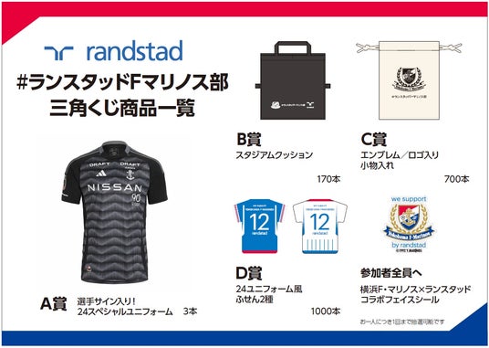 ハズレなしの抽選会では、横浜F・マリノスの畠中選手(4番)、エウベル選手(7番)、ヤンマテウス選手(11番)、天野選手(20番)、山根選手(28番)、5名のサイン入り2024スペシャルユニフォームをはじめ、実際にF・マリノスサポーターの声を元に制作されたスタジアムクッションやエンブレム/ロゴ入り小物入れ等、F・マリノスファンには嬉しいオリジナルグッズをご用意しています。また抽選参加者全員にF・マリノスxランスタッドコラボフェイスシールを配布いたします。