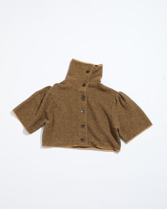 6ボタンカーディガンルーズなハイネックとショートスリーブのユニークなバランスが特徴のクロップド丈のボレロ風カーディガン。ベージュ×ブラックのMIXカラーを大阪店限定で発売します。