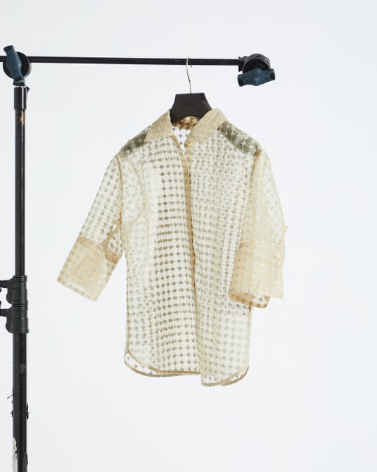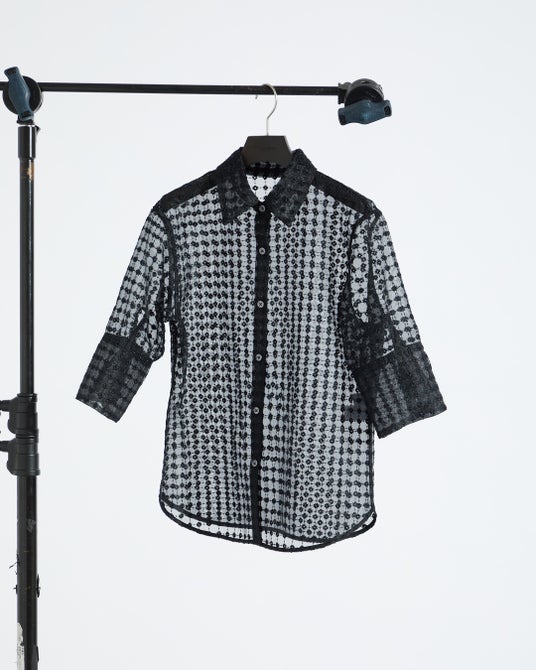 オーガンジー素材に繊細な小花のモチーフを刺繍したシアーシャツ。ヴィンテージウェアのムードが漂うレギュラーフィットのボディに7分丈のスリーブです。