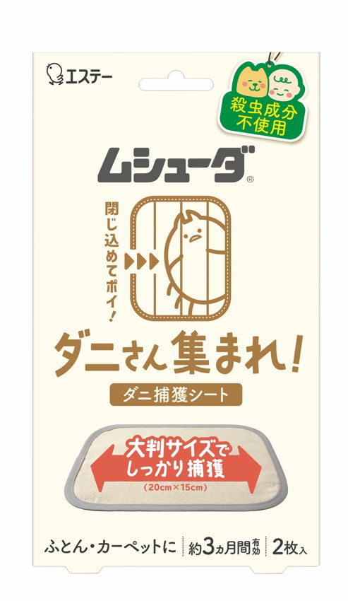 エステー株式会社は、殺虫成分を使わずに気になる場所に置くだけでダニを捕獲する大判サイズのダニ捕りシート「ムシューダ ダニさん集まれ! ダニ捕獲シート」を2月12日から、全国のスーパー、ドラッグストア、ホームセンター、ネットショップなどで新発売します。
