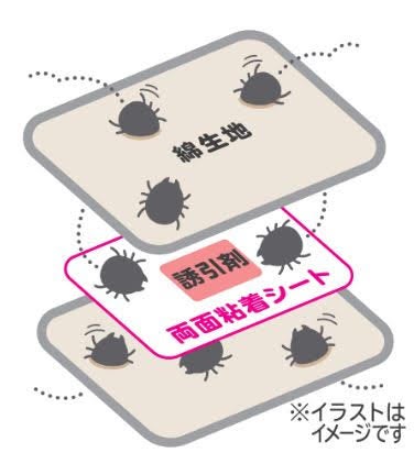 食品生まれの誘引成分(ダニ用フルーツエキス)が、ダニをシートに引き寄せ、大判サイズの粘着シートで捕獲します。殺虫成分不使用で、子供やペットがいる家庭でも使用できます。