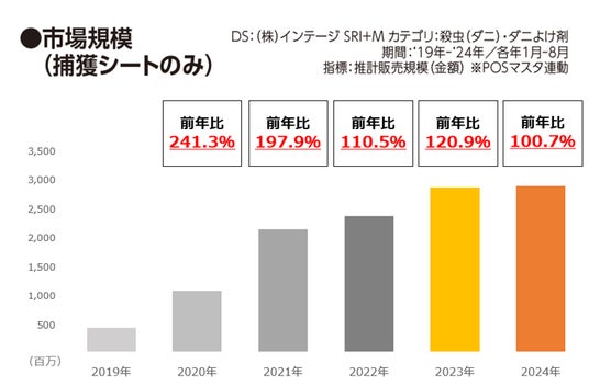 ダニ捕獲シートの市場(下グラフ)は、2019年以降大きく拡大していますが、直近の2024年は微増に留まっています。