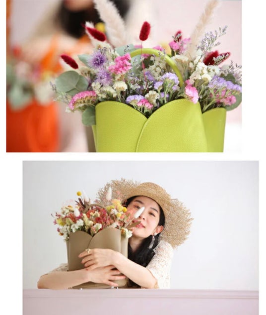 アパレルブランドCAWAIIの大人気商品「チューリップバッグ」に、体験型花屋Gyuttoのドライフラワー・プリザーブドフラワーでアレンジメントを施した、おしゃれな母の日ギフトです。飾っても素敵、バッグとして使ってもかわいい、2Way仕様。