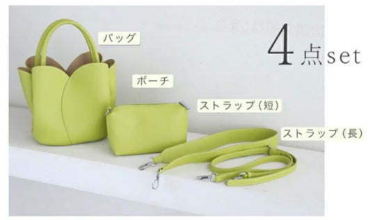 チューリップバッグは、バッグ以外にもポーチ、ストラップ2種の4点セット。