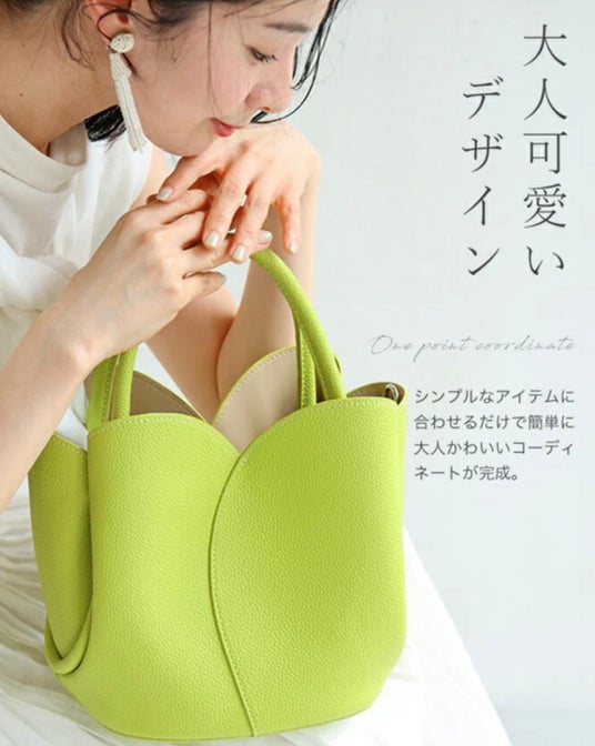 ころんとしたフォルムのチューリップバッグは、シンプルでも個性的な服装でもよく合います。