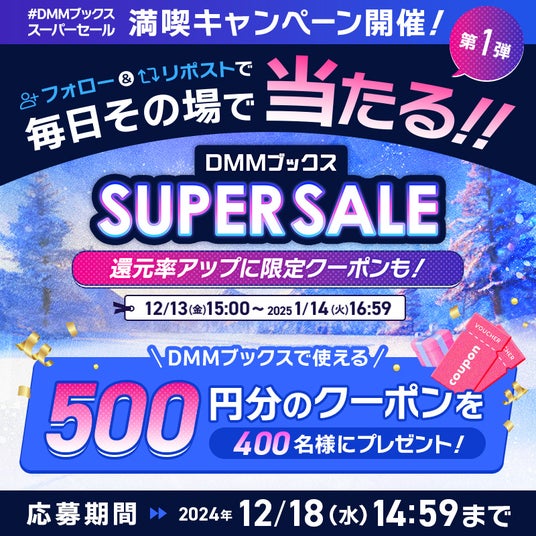 第1弾として2024年12月13日(金)から12月18(水)まで、DMMブックスで使える500円分のクーポンが400名にその場で当たる、「DMMブックス スーパーセール開催記念!フォロー&リポストキャンペーン」を開催します。