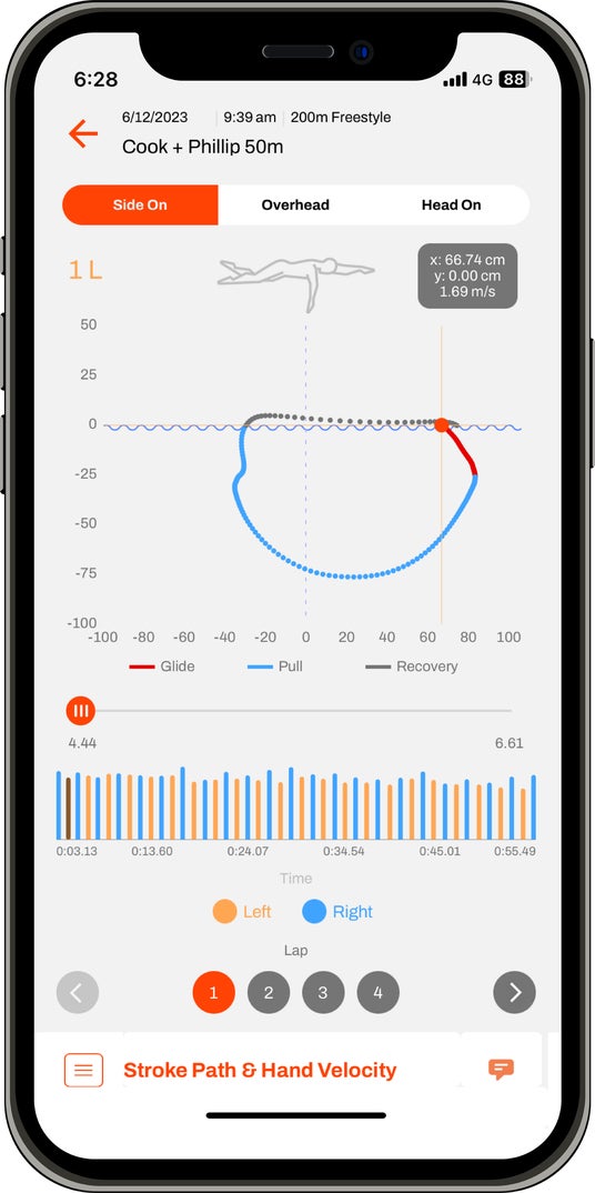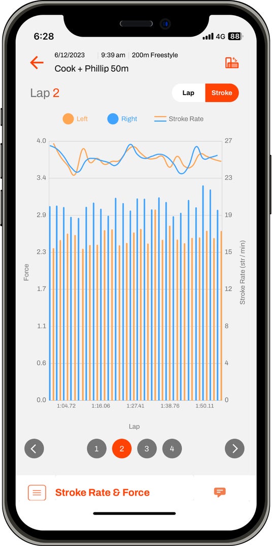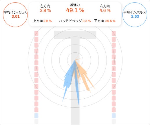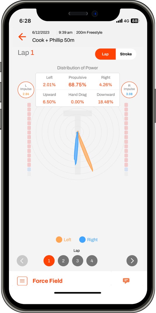 プラットフォームイメージ(フォースフィールド) データからは、左右ストロークの差、インスイープやアウトスイープによって推進力を奪っている箇所、疲労に伴ってストロークがどのように変化するかなど、自身の泳ぎを詳細に確認できます。これらのデータはすべて、ラップごと、あるいはストロークごとに見ることができ、さらにビデオと同期することで実際の手の動きを見ながら改善点を簡単に確認することも可能です。訓練された経験豊富な目や、優れた感覚を持つスイマーでさえ、eo SwimBETTERが提供する正確なデータと洞察にはかないません。