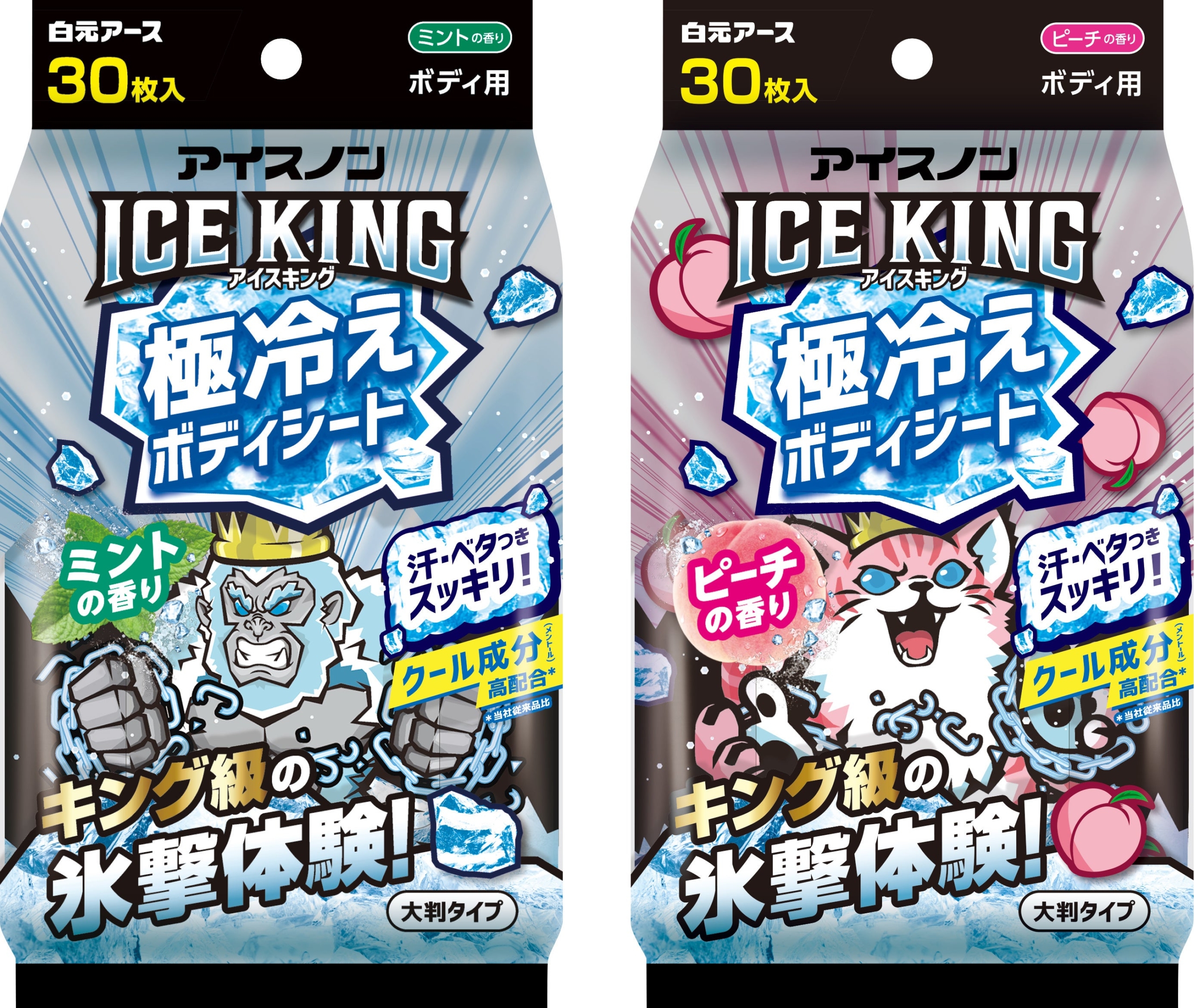 そこで、クール成分(メントール)高配合*で強力なクール感と爽快感が得られるボディシート『アイスノン ICE KING 極冷えボディシート』を発売いたします*当社従来品比。 極冷えシートが汗・ベタつき・ニオイのもとをスッキリふき取ります。また、丸まりにくく、破れにくい25×20cmの厚手の大判シートで、1枚で全身スッキリとリフレッシュできます。たっぷり30枚入りで、スポーツの後や通勤・通学時、レジャーやお出かけの時にはもちろん、寝起きや着替え前などのご使用にもオススメです。ラインナップは「ミントの香り」と「ピーチの香り」があります。