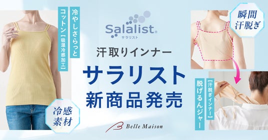 株式会社千趣会(本社:大阪市 代表取締役社長:梶原健司 以下千趣会)の通販事業ベルメゾンは、汗取りインナーブランド「Salalist(サラリスト)(R)」より、新シリーズ「冷やしさらっとコットン・ブラキャミソールリブ」(税込価格:2,290円~)、「脱げるんジャー」シリーズの新商品「瞬間!汗脱ぎインナー・脇背中(脱げるんジャー)」(税込価格:1,390円)など6商品を2025年3月25日(火)から販売開始します。(https://www.bellemaison.jp/)