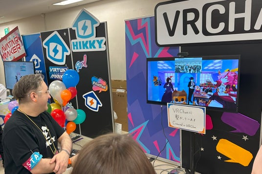 VRChatでは、リアル会場にVRChatスタッフ(運営スタッフ)が来るとともに、VRChatとリアル会場を繋いで、バーチャルでもリアルからでも運営の人と直接会話ができるブースを用意しました。