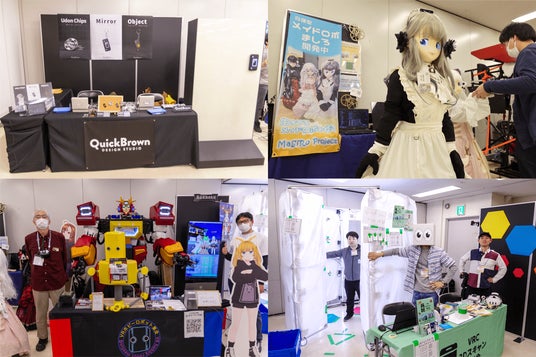 QuickBrownは、VRChatにある鏡「アバターミラー」をリアルに再現。MaSiRoプロジェクトは、手を繋いで一緒に歩くことができるメイドロボットを紹介。「VRホビーロボット集会」は、勇者技術研究所とコラボして巨大ロボット「ファイバリオン」などを展示。3Dスキャン同好会は、全身を撮影してリアルの姿をそのままバーチャル化するブースを出して注目されていました。