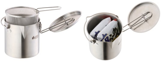 炊飯、茹でる、揚げる、煮るなどさまざまな調理に活躍する万能ケトルと専用のザルセット。錆に強く、耐熱性・耐久性に優れたステンレスを採用。