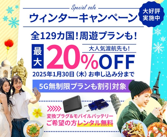 お客様への日頃の感謝の気持ちを込めまして、海外WiFiレンタルサービス「WiFiトラベル」にて【最大20%OFF】のウインターキャンペーンを開催します。
