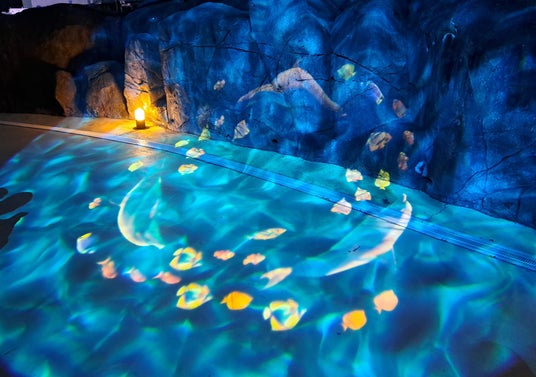 <海底のこみち>海底をイメージした青い光の中にかわいらしい海の生き物たちが投影されます。「光の花園」まで、まるで海底を散歩しているかのようなこみちが表現されています。(produced by ELEMENTS)
