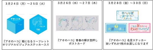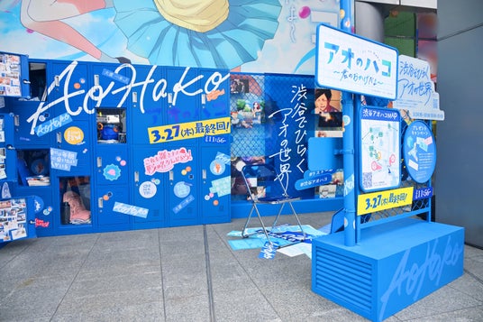 また、MAGNET by SHIBUYA109 エントランスイベントスペースでは、描き下ろしイラストを使用したビッグボードや、部室のロッカーをモチーフにしたフォトスポットを設置。渋谷駅近辺9か所のストリートボードでは、各キャラクターの名シーン&名言ビジュアルを展開。KEIO MIRARERU VISION 渋谷メガウォールではスペシャルムービーを上映し、渋谷が『アオのハコ』一色に。