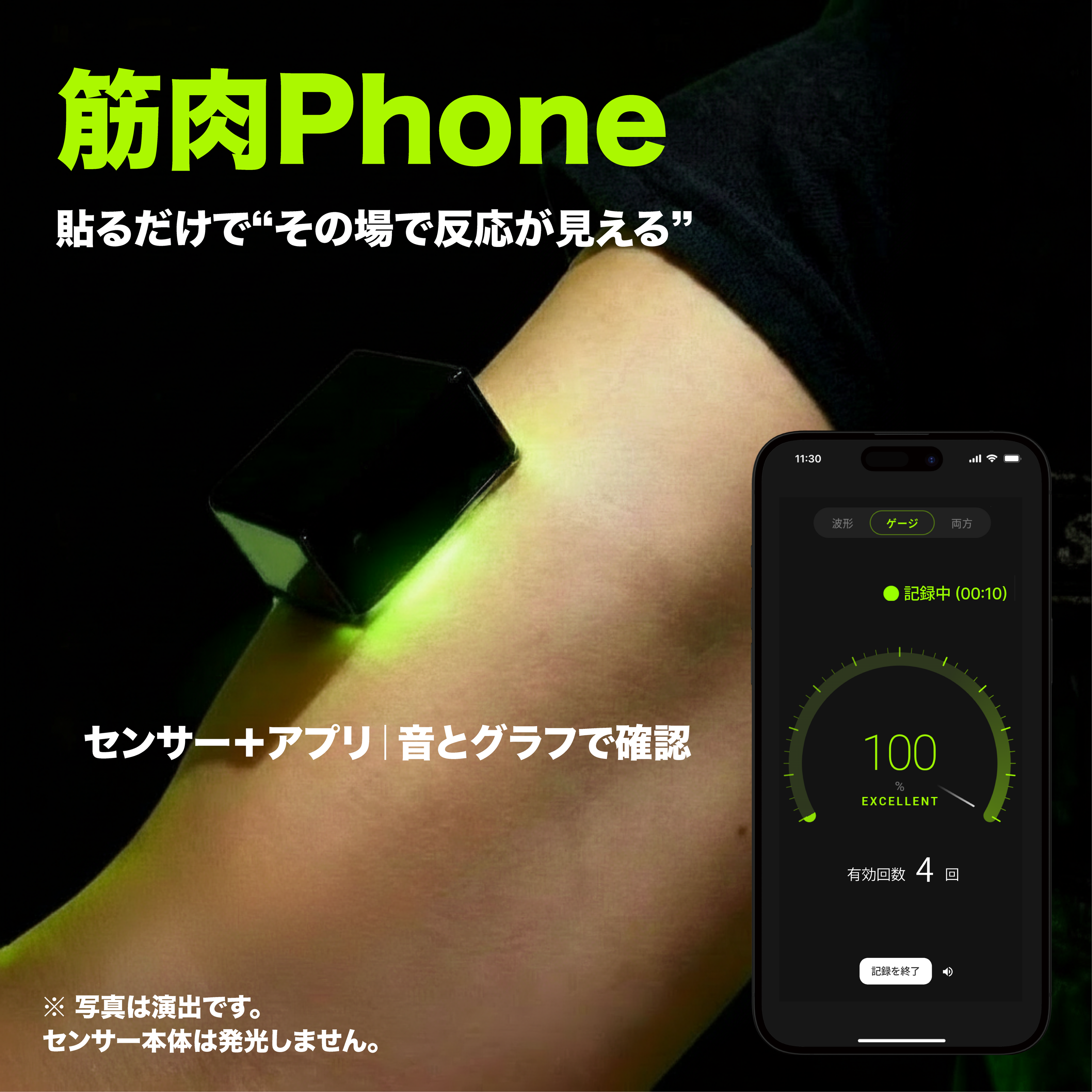 筋肉Phoneは、スマートフォンに接続して使用する小型の表面筋電図センサーです。筋トレ中の腕や脚にセンサーを貼ることで、筋肉がどれだけ活動しているかをスマートフォンのアプリ上でグラフや音としてリアルタイムに「見える化」します。 これにより、利用者は「今、自分の筋肉にしっかり効いているか」を直感的に確認でき、正しいフォームの習得とトレーニング効果の実感、そして習慣化へと繋がります。