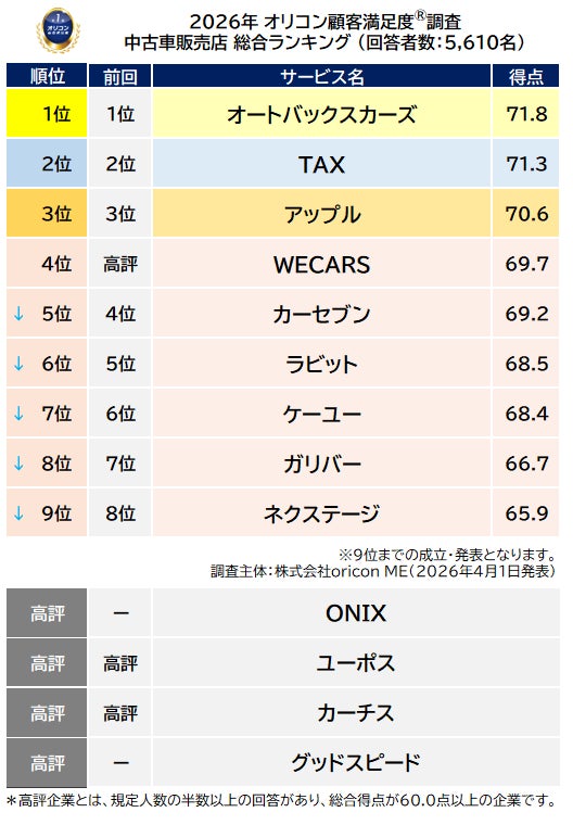 オリコン株式会社(本社:東京都港区 代表取締役社長:小池 恒、略称:オリコン)は、グループ会社である株式会社oricon MEが、実際のサービス利用者を対象に第三者の立場で実施した『中古車販売店』の顧客満足度調査の結果を、2026年4月1日(水)14時に「オリコン顧客満足度(R)」公式サイト内にて発表いたしました。ランキングの結果は下記の通りとなりました。