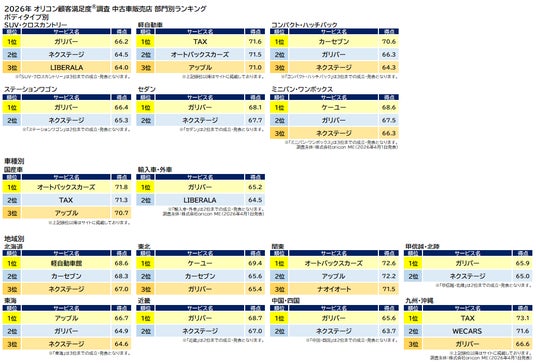 『中古車販売店』評価項目別ランキング(2026年 オリコン顧客満足度(R)調査)