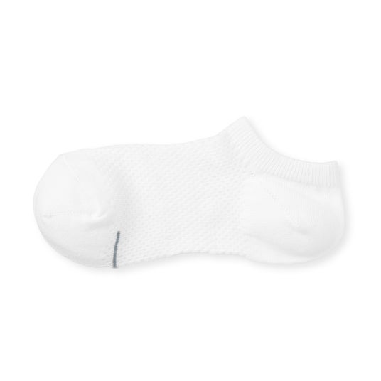 蒸れにくい素材を使い、通気性のある全面メッシュ編みに仕上げました。汗の臭いを抑え、暑い季節でもさらっと過ごせる靴下です。ショート丈のため、サンダルにも革靴にも合わせやすく、夏の装いに取り入れやすい一足です。綿はオーガニックコットンを使用しています。