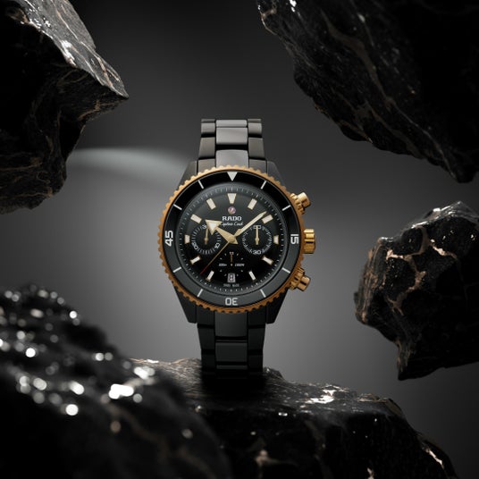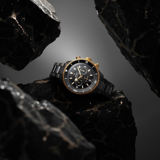 クロノグラフのアワーカウンターは新たに追加された機能です。12時の位置に配置されたラドーのムービングアンカーシンボルは合成ルビーのバックプレート上で回転し、6時位置にはインデックスにマッチした台形型の日付表示が設けられています。縁には繊細な分トラックが施され、シンプルながら機能的なエングレービング加工を施された回転ベゼルが全体を引き締めます。 これらの要素が一体となって、「less is more(より少ないことは、より豊かなこと)」というデザイン哲学が見事に表現されています。このアプローチは最大59時間のパワーリザーブ機能を備えたラドーキャリバーR801自動巻ムーブメントにも反映されており、クリスタルを含むケースの厚みはわずか16.2mm。スリムに抑えることで、スタイリッシュに装着できるサイズ感を実現しました。 時計製造においてよく求められるスポーティさとスタイリッシュさのバランスですが、キャプテンクック ハイテクセラミック クロノグラフは、そのどちらも妥協することなく、両方の特徴を兼ね備えています。 ハイテクセラミックの魅力 - 他にはない感触 これがまさにラドーのハイテクセラミックの本質です。そして私たちが「Feel it.」と言う理由もそこにあります。ハイテクセラミックは耐久性に優れ、「マスター・オブ・マテリアル」であるラドーの技術と経験の結晶です。ハイテクセラミックは、美しく軽量な物質で耐傷性(スクラッチレジスタント)にも優れています。 ハイテクセラミックは素材として傑出した品質を持っていますが、それだけにはとどまりません。ほぼ全てのものから影響を受けにくく、損傷しづらいだけでなく、 肌なじみもよく絹のような感触を持っています。どんなサイズやデザインの時計でも、まるで手首に寄り添うようにフィットし、一体感を生み出します。特にブレスレットにもセラミックを使用している時計は、その独特の着け心地が忘れがたい体験となるでしょう。 ハイテクセラミックの歴史 ラドーが初めてハイテクセラミックを世界に紹介したのは1986年のことです。