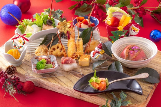 ニョッキやアヒージョなど、ひと味違った創作串を愉しめるクリスマス限定コース。華やかな味わいの締めには、贅沢なローストビーフ丼で心躍るひとときを。
