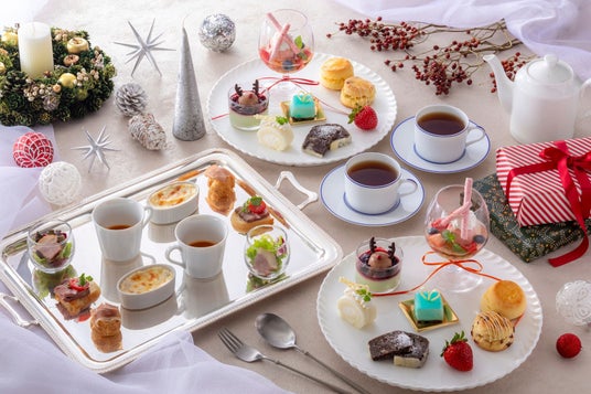 大切な人との心温まるパーティがテーマのアフタヌーンティーセット。プレゼントボックス仕立てのムースやロゼスパークリングワインジュレのパフェなど、可憐なスイーツが冬のひとときを盛り上げます。