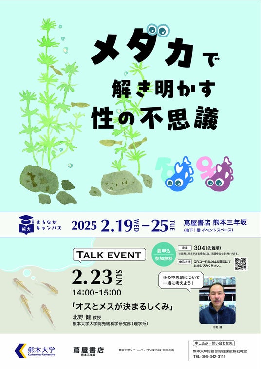 熊本大学はニューコ・ワン株式会社※との共同企画で、熊大まちなかキャンパス「メダカで解き明かす性の不思議」展を、下記のとおり開催します。