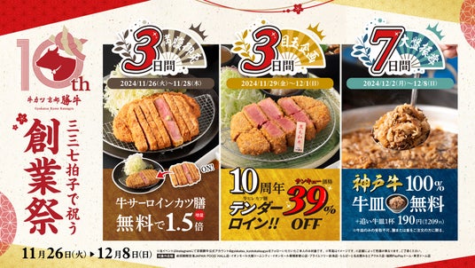 牛カツ京都勝牛『10周年創業祭』開催!「無料で牛カツ1.5倍増量」「牛ヒレカツ39%オフ」「神戸牛100%牛皿無料」など、いい肉の日(11月29日)~創業日(12月1日)を含む13日間のお祭り!