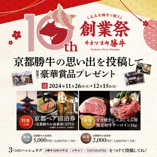 牛カツ京都勝牛からお客様へ10年分の感謝の気持ちを込めて、2024年11月26日(火)~12月8日(日)までの期間限定で、縁起担ぎの「三三七拍子(さんさんななびょうし)」をテーマに13日間に渡って3つの特別企画を開催!