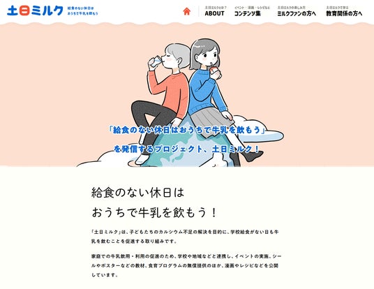 「土日ミルク」学校給食がない日は、ある日に比べ、子どもたちのカルシウムをはじめとする栄養素の不足が顕著であることから、学校給食がない日でも子どもたちに楽しく牛乳を飲みたい・乳製品をとりたいと思ってもらえる意識づくりや環境づくり促すために実施している取り組みです。