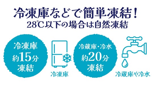 冷蔵庫・冷水の場合約20分、冷凍庫の場合約15分で中材が簡単に凍結!28℃以下の場合は自然凍結します。