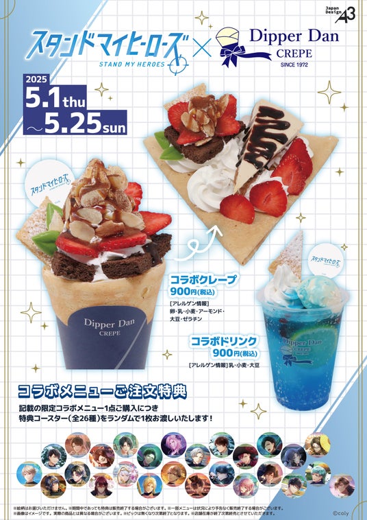 クレープチェーンとして売上日本一(富士経済調べ)の「ディッパーダン」を展開している株式会社オレンジフードコート(本社:東京都中央区、代表取締役:越智 雅也)は、2025年5月1日(木)より2025年5月25日(日)の期間、 『スタンドマイヒーローズ(スタマイ)』のコラボキャンペーンを開催いたします。 注)一部対象外店舗がございます。 ▼ブランド公式サイト  https://www.dipperdan.jp 「スタンドマイヒーローズ」コラボキャンペーンについて ■コラボキャンペーン概要 ・開催期間:2025年5月1日(木)~2025年5月25日(日) ・開催店舗:ディッパーダン各店(一部対象外店舗がございます) ・展開内容: 1.コラボメニュー(クレープ&ドリンク各1種)の販売 2.上記メニューご購入にてノベルティプレゼント 3.数量限定でロゴピック装飾付きにてご提供 ※ノベルティは各店数量限定、無くなり次第終了となります。 ※ピックは商品装飾として無くなり次第終了いたします 対象外の店舗情報含め、詳細はキャンペーンWEBサイトをご確認ください。