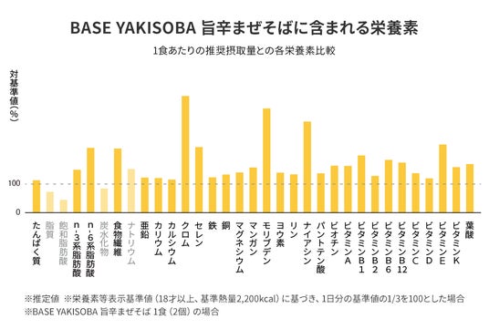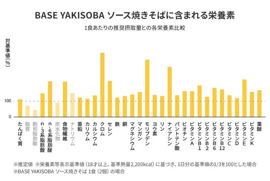 全粒粉をベースに主に植物由来の原材料を使用し、1食(2個)でたんばく質、食物繊維、ビタミン・ミネラルなど、からだに必要な33種類の栄養素をバランスよく含んでいます。「BASE YAKISOBA ソース焼きそば」には、たんぱく質15.2g、食物繊維7.1g、鉄1.4mg、カルシウム155mgが、「BASE YAKISOBA 旨辛まぜそば」には、たんぱく質15.3g、食物繊維7.1g、鉄1.4mg、カルシウム131mgが含まれています。