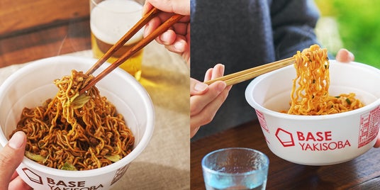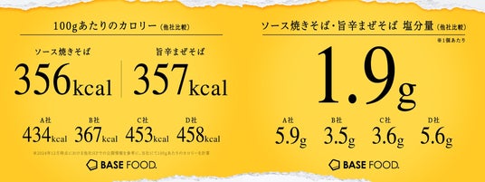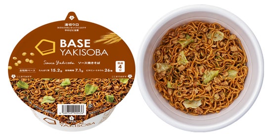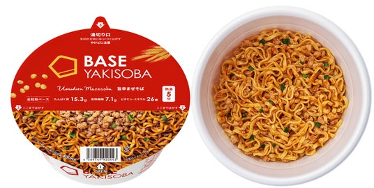 フレーバーは、香ばしくまろやかなソースの旨みが広がる「BASE YAKISOBA ソース焼きそば」と、4種のスパイスの辛味と旨味が広がる「BASE YAKISOBA 旨辛まぜそば」の2種を新発売。