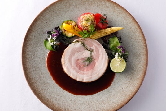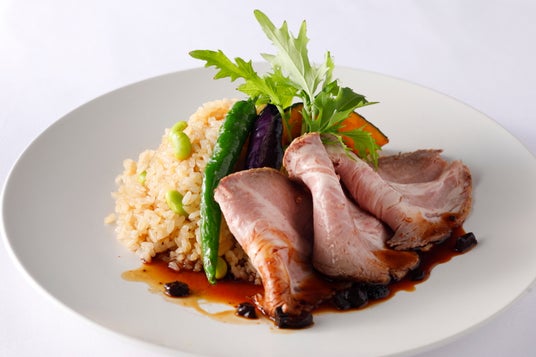 青森県産“長谷川の自然熟成豚”のロースト 黒にんにくのソース 生姜の香るピラフとともに